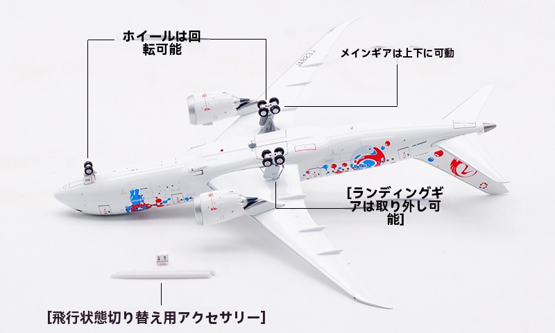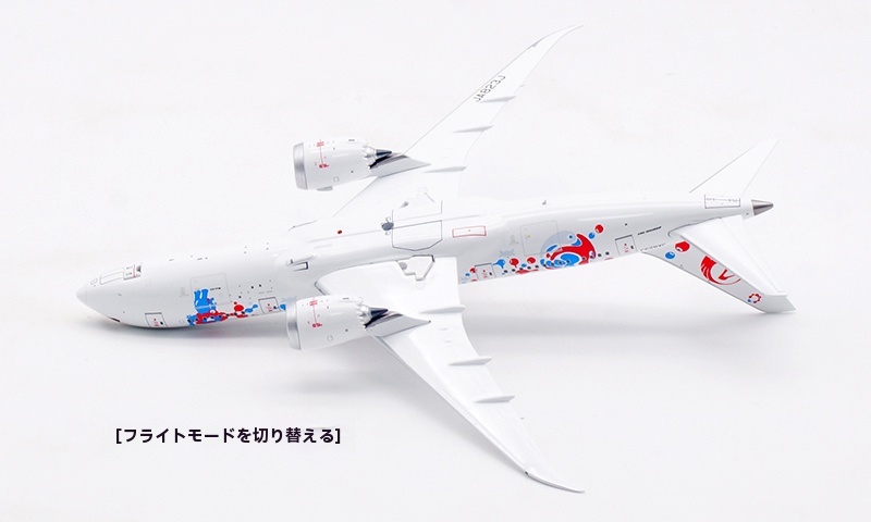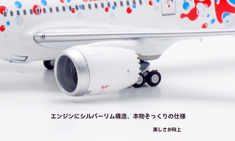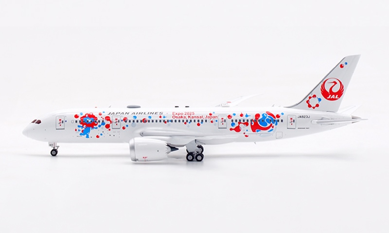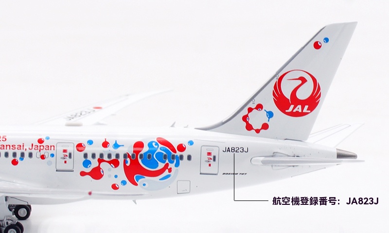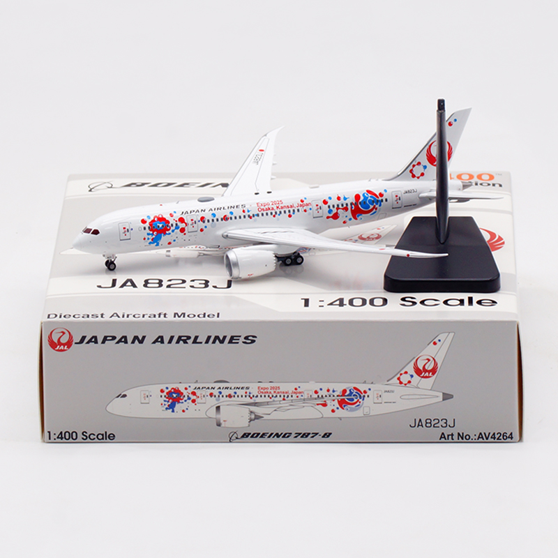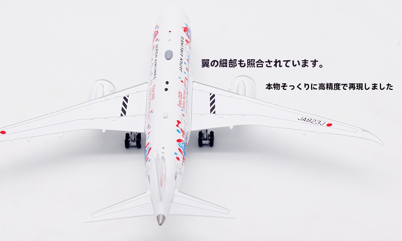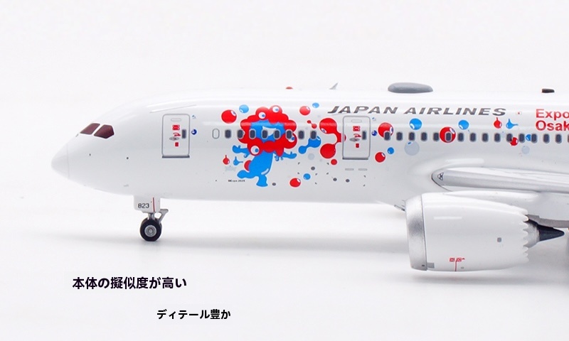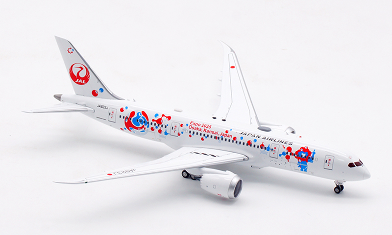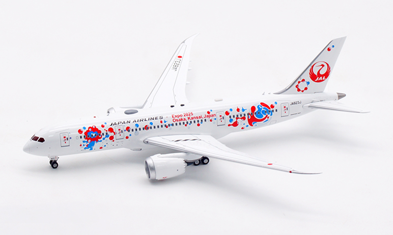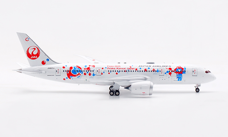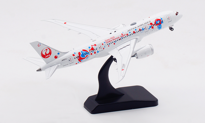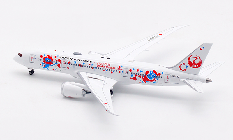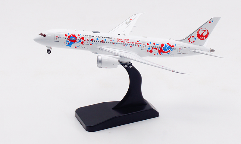 日本航空が誇るボーイング 787-8 ドリームライナー(登録番号 JA823J)番号 34833、2013年8月に導入された本機は、Expo 2025 Osaka をモチーフとした特別塗装をまとい、華やかかつ印象的な外観が多くの注目を集めております。さらに、 JAL の“MYAKU-MYAKU JET”プロジェクトにも採用され、国際線・近距離国際線での運航を通じて、世界と大阪の未来をつなぐ役目を果たしております。洗練された姿と未来志向の意匠を映す、大変意義深いコレクションモデルと存じます。